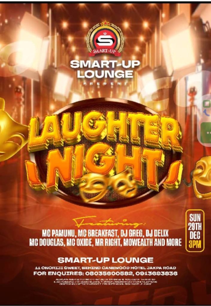 Warri, December 27, 2024 – Smart-up Lounge, Warri’s premier entertainment hub, is all set to host “Laughter Night,” a sidesplitting comedy extravaganza, on Sunday, December 29, 2024. The event promises to bring together some of the best comedians and comic musicians in the industry, guaranteeing an unforgettable night of laughter and entertainment.